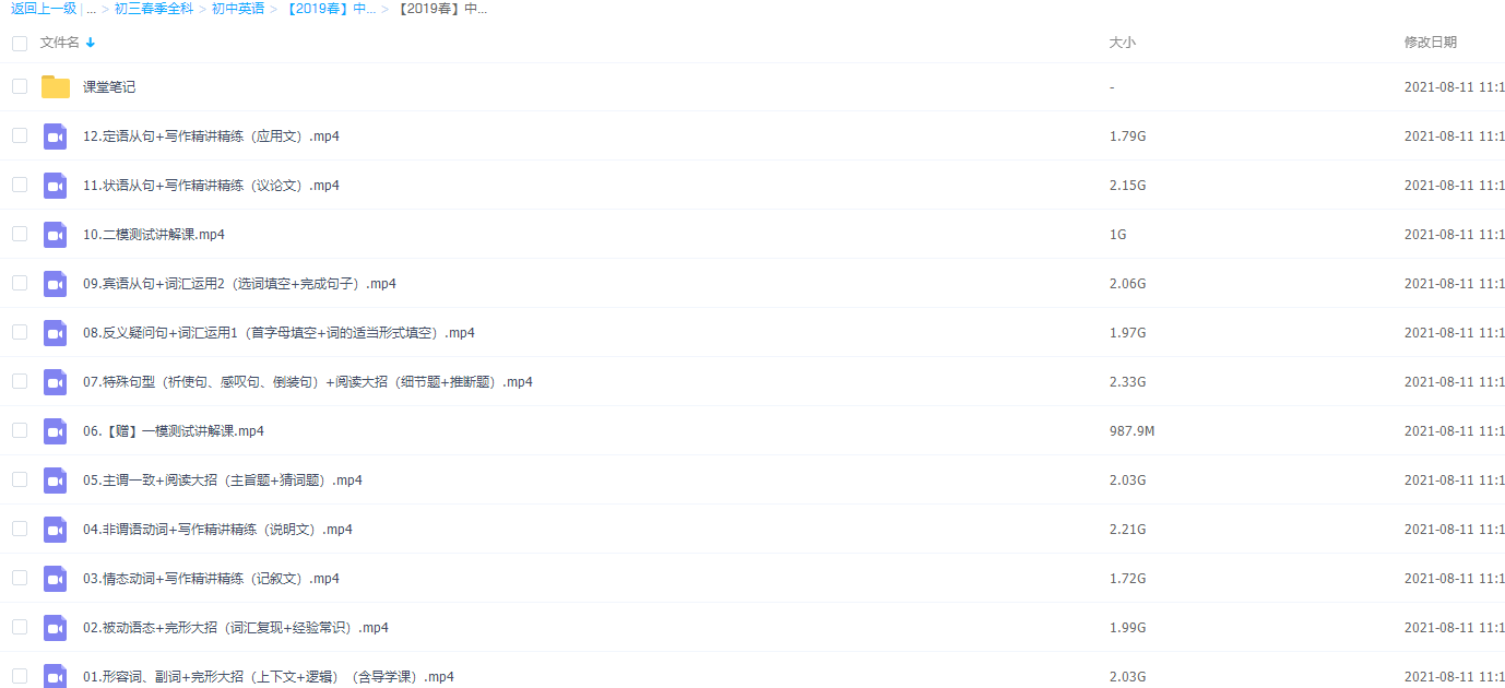 此课件来自作业帮网校,中考英语二轮提升班(王凯皎),包含视频课程和讲义资料。此课件主要知识点包括:形容词、副词+完形大招(上下文+逻辑)、被动语态+完形大招(词汇复现+经验常识) 、情态动词+写作精讲精练〔记叙文)、非谓语动词+写作精讲精练(说明文)等视频
