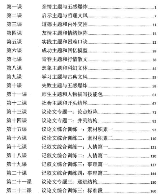 - 教学内容根据全国中考作文命题趋势,将中考作文分成12个主题,72中心,用24次课一网打尽中考记叙文和议论文。