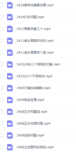 此课件来自二年级奥数高斯数学看动画学二年级奥数课程,此课件主要知识点包括:过河问题、奇偶应用、多角度观察、有趣的乘法、图形规律进阶、除法的含义、画图推理、列表推理、公元年的认识、整数分拆、平移、首位分析、移多补少、共用火柴棒、整十整百巧算等视频