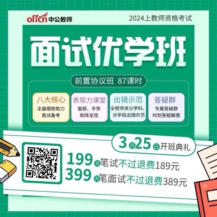 2024上教师资格面试时间:5月11日-12日在等笔试成绩的过程中,你该做些什么?那不如来学习吧!【2024上教资资格面试优学协议班】来啦!面试课程,就要看得见:全程师资分学段、分学科出镜示范表现力课堂:面部、首饰逐帧呈现第二期课程开始时间:3月25日两种价格,两种选择:199元,未进面退189元;399元,未进面退389元;进面后面试未过退389元!你的对手都来学习了,你还在观望吗?扫码查看课程详情