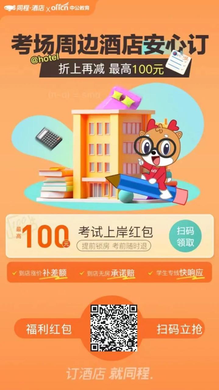 出行安排,定酒店就选同城呀!给咱们的学员特有的订房优惠券,比他们官网优惠额度大!记得考场周边酒店安心订!折上再减 最高100元,识别下方二维码即可查询订房间呀!